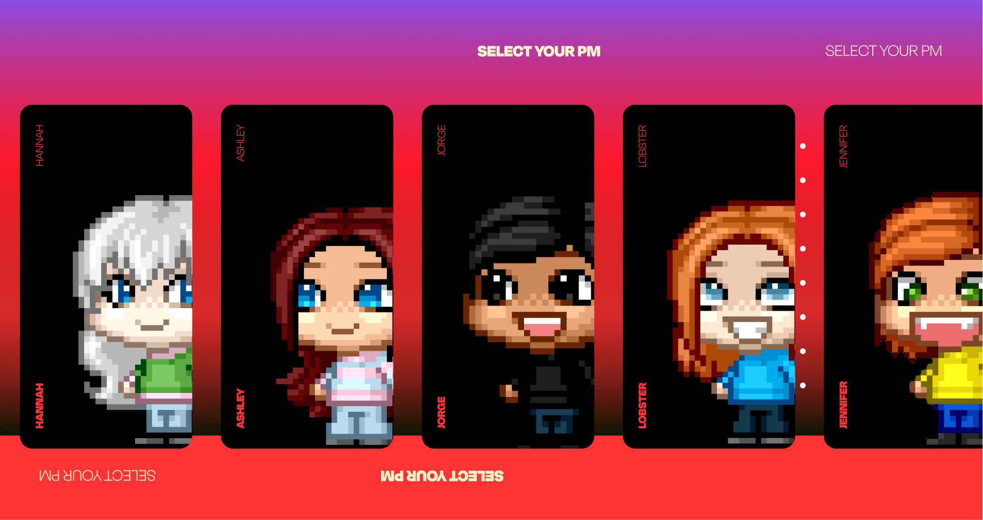 The PM team introduced a playful Character Creator concept, reimagining Digital Project Management as an adorable yet competitive 8-bit world. In this theme, every PM becomes a chibi-style hero embarking on quests and battles to launch top-tier digital projects. Clients “choose their champion” by reviewing each PM’s stats, personality, and unique strengths, turning team capabilities into a fun, gamified showcase.